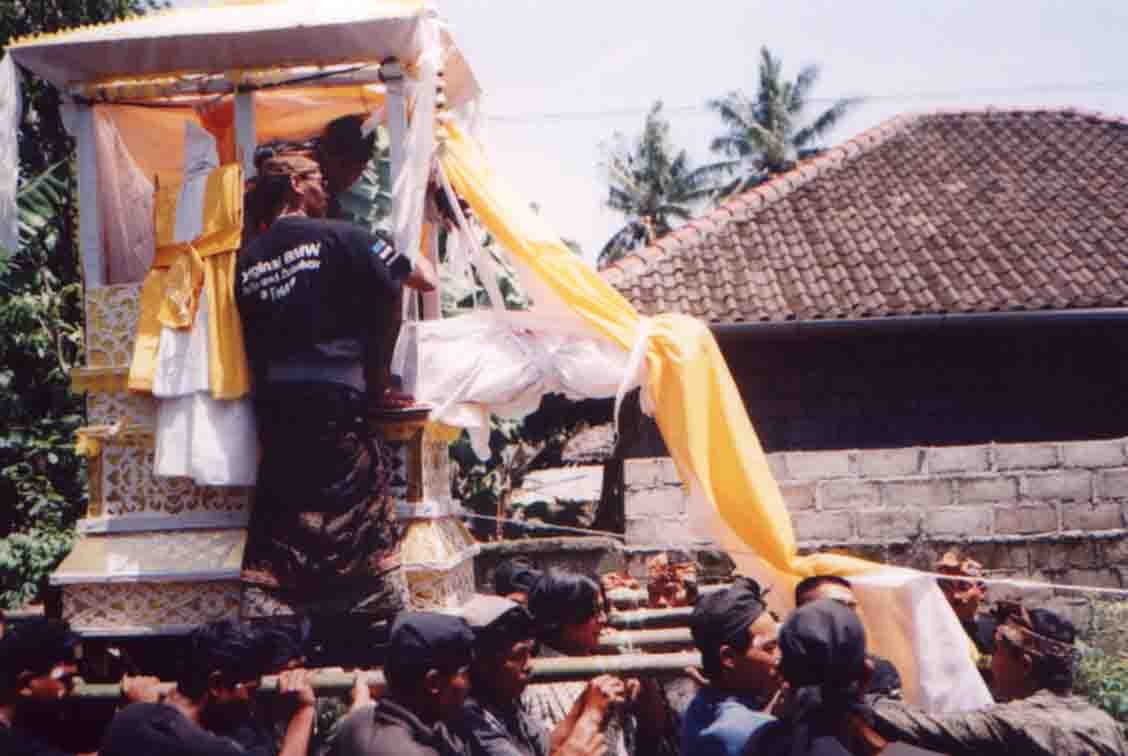 Hier ist eine Kremation zu sehen. Die Balinesen glauben an die Reinkarnation und verbrennen ihre Verstorbenen öffentlich. Diese Verbrennung hat fast Volksfestcharakter. Uns war es vergönnt, gleich 2 Kremationen zeitgleich mitzuerleben. Nach solchen Kremationen muß man sich direkt beim Reiseleiter erkundigen - es wird nicht öffentlich angeboten.