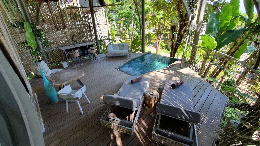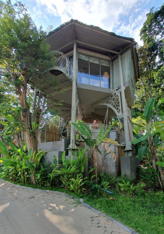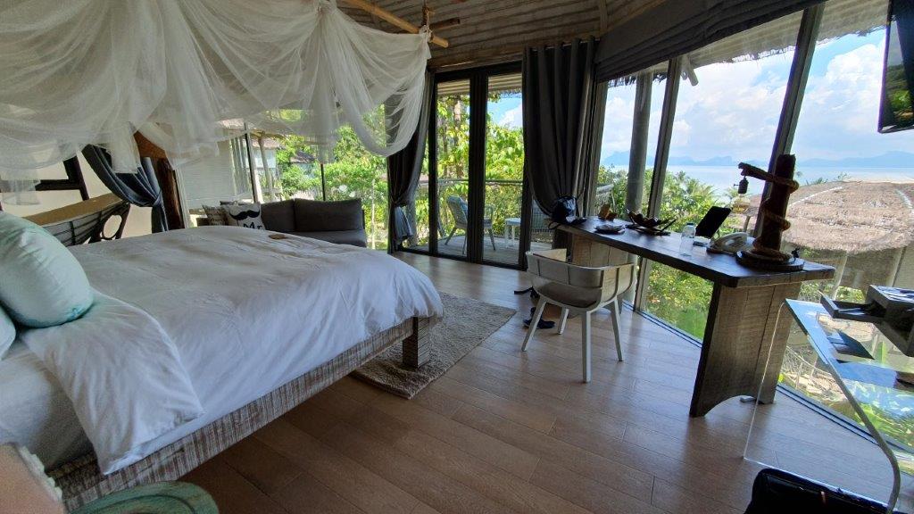 Die zweite Woche verbrachten wir auf der Insel Koh Yao Noi im Hotel "Treehouse Villas". Die 2-stöckige allein bewohnte Villa ist mit eigenem Pool und 2 Minibars (jeweils in einer Etage) ausgestattet, wobei die Minibars täglich neu aufgefüllt werden mit Softdrinks, Bier, Whisky und Gin. Das war schon deshalb von Vorteil, da hier keine Möglichkeit besteht, ggf. in einen Ort zu gehen, um sich mit preisgünstigen Getränken zu versorgen. Entsprechend preisintensiv war natürlich auch die Beköstigung im Hotel (wir hatten nur Frühstück). Das von uns auch nutzbare - eine Preiskategorie niedrigere - Hotel hatte zwar etwas günstigere Preise, dennoch mussten auch dort z.B. für einen einfachen Burger 12,- € bezahlt werden. Manch einer wird jetzt denken - das ist Jammern auf hohem Niveau - und wird damit auch recht haben. Jedoch wird eben die Unmöglichkeit - sich anderweitig zu versorgen - erkennbar durch hohe Preisgestaltung ausgenutzt. Jedenfalls war das Frühstück reichhaltig und abwechslungsreich, wobei der deutsche Küchenchef täglich u.a. Salami, Salamiwürstchen und Rächerschinkenservieren lies. Beim Fernsehgerät sind Amazon Prime und Netflix vorinstalliert und mit eigenem Account nutzbar. Der kostenlose WLAN-Empfang ist leider in kurzen Abständen von etwa 30 Minuten für Bruchteile plötzlich unterbrochen, so dass dies etwas störend war (z.B. bei Internettelefonie).